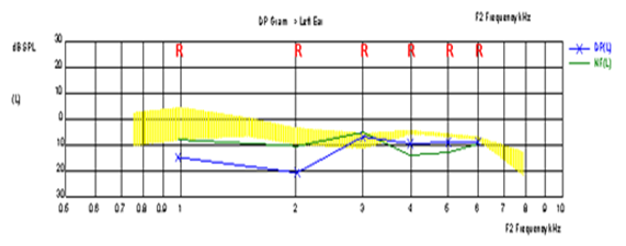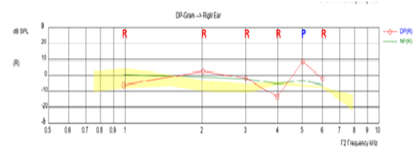 DPOAE results of participants were measured at distortion product frequency from 1 KHz to 6KHz. Across all the frequencies the DPOAE's were absent for participant A in both the ears except at 3328 Hz in right ear. The Figure 1 & 2 indicates the results of DPOAE for left ear and right ear with a letter "R" across the frequencies. "R" indicates "refer" i.e. there is no response from the outer hair cells in both the ears. The Figure 3 & 4 depicts participant B’s DPOAE response from the outer hair cells, indicating pass with the letter "P" across frequencies.