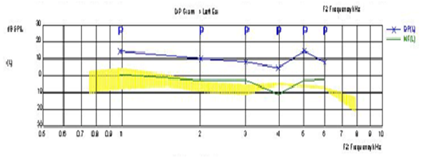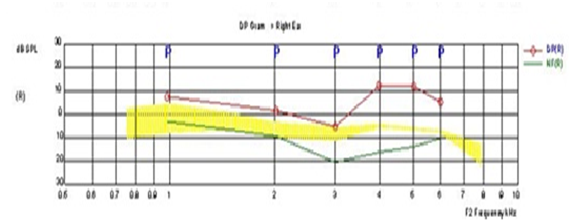 Distortion product otoacoustic emission (DPOAE) was performed in both ears to evaluate the function of outer hair cells. DPOAE testing was performed by setting the frequency band from 1000Hz to 6000Hz at stimulus intensity L1=65dBSPL & L2= 55dBSPL, frequency ratio F2: F1=1.2:1 and signal to noise ratio of at least 6dB with a reproducibility score of at least 70%.