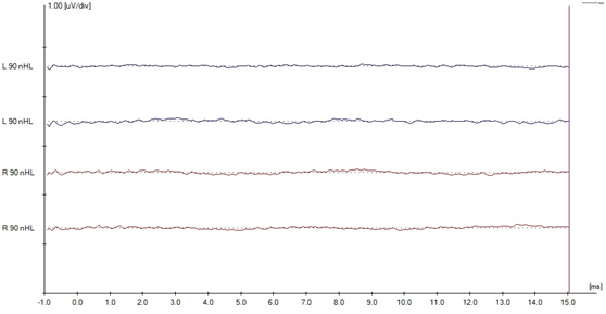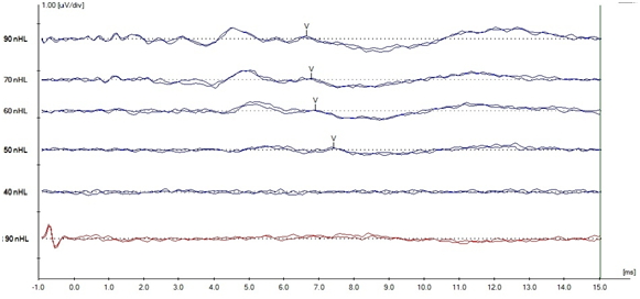 ABR testing was performed for threshold estimation.20 It is also used to check the reliability of hearing thresholds by comparing with pure tone behaviour threshold.18 In participant A, no Vth peak was found even repeated trail at 90dBnHL in both ears (Figure 5). This finding is suggestive of client having bilateral severe to profound hearing loss. In Participant B, clear Vth peak with replicable waveform was found even repeated trail at 70dBnHL & 60dBnHL but not at 50dBnHL in both ears (Figure 6). This finding is suggestive of client having mild sensorineural hearing loss. In the previous study, it was found that abnormal ABR obtained in children with the previous history of gestational rubella infection in which profound hearing loss are more evident than lesser degree of hearing loss.17,19 Thus, in the current study, participant "A" had bilateral severe to profound sensorineural hearing loss & participant "B" had mild sensorineural hearing loss.21,22