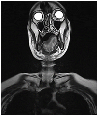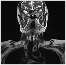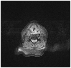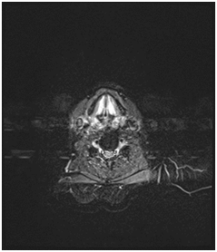 Figure 1 MRI neck with contrast, axial cut showing supraglottic mass lesion partially occluding the airway.