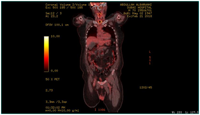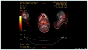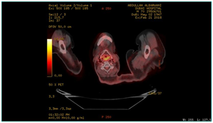 A biopsy was taken and histopathology was done using immunohistochemically markers and showed angiosarcoma, PET CT scan was performed on 21/02/2018 and showed the following: hypermetabolic suspicious lymph node in the right infraclavicular region, hypermetabolic focus in the region of the left mandible, adjusting left margin of the tongue and the hypopharynx (Figure 4–6). Patient was diagnosed before as squamous cell carcinoma of the right lateral side of the tongue. Patient was operated in Oman on 8th November, 2006 for a white tongue lesion, and then operated again on 13th December, 2006 for tongue carcinoma. Lastly, partial Glossectomy was done for recurrent tongue carcinoma on 24th March, 2010 (Figure 7). After surgery, patient received total radiotherapy treatment of the face and neck using 6 MV photons, 2 fields and a total dose of 60Gy (44 Gy+20 Gy off cord) from 21st June, 2010 till 03rd August, 2010. Patient was then referred to a specialized center, where further management was done. This case was reported to high light an infrequent long-term complication of radiotherapy.