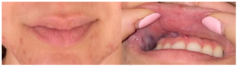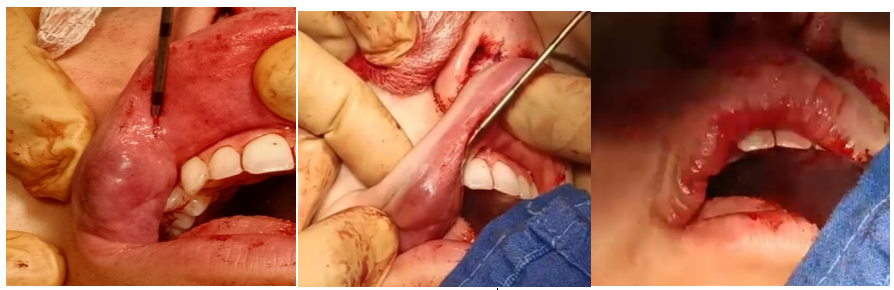 A 25-year-old female patient presented for consultation in January 2022, complaining of a violaceous tumor located in the right labial commissure, upper lip, and ipsilateral cheek mucosa, the tumor had been present since birth and had already been treated twice without success. The first treatment performed was selective arterial embolization and given no improvement, then they proposed surgery with an arterial clip, which did not have a favorable result either. On physical examination, a violaceous tumor is observed on the upper lip, right commissure of the mouth, with increased volume, soft and painless on palpation with a change in color on digital pressure, mouth opening without complications, and prolongation of the mucosal lesion of the right cheek, involving superficial and deep tissue