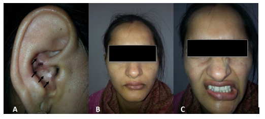 A 23-year-old female complained of Right ear pain for 3days duration; on examination the ear was normal and she was prescribed analgesics. Two days later, the patient noticed weakness on the entire right side of the face. She was diagnosed with Bell’s palsy and oral treatment with methylprednisolone (1mg/kg/day) was commenced. On the second day of treatment with steroids, painful blisters with crusts developed in her right ear (Figure 1A). There was no history of dizziness or tinnitus. The patient had Grade 2 House- Brackmann (HB) facial paralysis (Figure 1B, 1C). Laboratory findings (complete blood count and erythrocyte sedimentation rate) were within normal limits. The patient had a normal pure tone audiogram and impedance audiometry. Based on the above finding, she was diagnosed with RHS and a 7-day course of oral acyclovir 800mg 5times a day was commenced. The patient had no other comorbidities. On follow up, the ear lesions disappeared within 2weeks, and the facial paralysis resolved completely by the end of 4weeks.