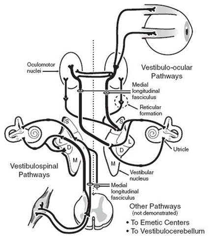Dizziness or vertigo from ETO can be explained by increase of inner pressure of vestibular organ. It is because negative middle ear pressure gives rise to the retraction of tympanic membrane, and it makes the stapes push against the oval window.3 It seems obvious that obstruction of the Eustachian tube somehow disturbs the air pressure and causes stimulation of the perilymph, which interferes with normal balance as maintained by the labyrinthine mechanism.4 In this light, we cannot help accepting the clear proposition that ETO is the obvious cause for ‘loss of vestibular function’, and gives rise to ‘peripheral vestibular loss’ at the end. Recognition of the head’s movement relative to the body is provided by the linear (otolithic macula) and angular (semicircular canals) acceleration receptors of the inner ear. Electrical activity generated within the inner ear travels along the vestibular nerve (primary afferent neuronal pathway) to the central vestibular nuclei of the brainstem, forming second-order neuronal pathways that become the vestibulo-ocular reflex (VOR), the vestibule spinal tracts, and the vestibule cerebellar tracts. Pathways derived from vestibular information also travel to the brainstem emetic centers, which serves to explain vegetative symptoms such as nausea, vomiting, and perspiration that a patient typically experiences following an acute unilateral vestibular loss (Figure 1).3 So to speak, ETO which somehow disturbs the air pressure and causes stimulation of the perilymph, interferes with normal balance as maintained by the labyrinthine mechanism. And such electrical activity generated within the inner ear, travels to the brainstem emetic centers, which serves to explain vegetative symptoms such as nausea, vomiting, and perspiration that a patient typically experiences following an acute unilateral vestibular loss. Specificatively, in considering the principal causes of this vestibular loss, ETO should never be excluded from them.