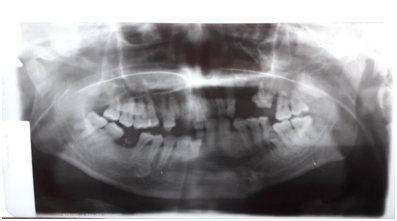 Figure 1 Pre-operative Panoramic X-ray showing a displaced right condyle on the left side of the picture.