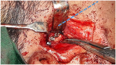 The condylar neck fracture was identified through the preauricular incision and the proximal segment was verified to be displaced medially. A submandibular incision was used to expose the angle of the right hemimandible. A subperiosteal tunnel from the superior incision to the inferior incision was created using a Freer. By sliding the Freer subperiosteally, the Facial nerve was safely avoided (Figure 3) (Figure 4). After the condylar head was identified and returned to the empty glenoid fossa the fragment was rotated then held and oriented by means of a 7 mm. titanium self-tapping screw that was screwed half-way into the condylar segment that served as its handle and stabilizer. The angle of the right hemimandible was then grasped using a bone holder and downward traction was applied to make space to facilitate repositioning the condylar fragment. MMF and Gilmer wires have not been applied. This was to facilitate traction of the mandible downwards.