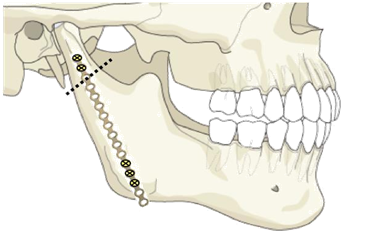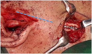 Figure 4 Distal End of the Titanium Plate fixed to the Ramus of the Mandible (dotted lines show the lie of the miniplate).