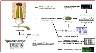 The first Molecular Biology approach in Endodontics was made by Conrads et al.,12 One of the earliest methods developed by Kary Mullis was Polymerase chain reaction (amplification). Isolation of previously unknown species from endodontic infection- B. forsythus and T. denticola, Dialister pneumosintes and Filifactor alocis T. parvum and T. putidum have been possible by PCR.13,14 Many variants of PCR -Multiplex PCR, Nested PCR, Arbitary primed PCR, Quantitative PCR, Reverse Transcriptase PCR, Real Time PCR were eventually developed. Real time PCR identifies the target by fluorescently labeled probe. PCR products can be analyzed by Denaturing Gradient Gel Electrophoresis (DGGE).15 Later with the introduction of checkerboard DNA hybridization, large number of DNA samples were hybridized from single /multiple samples forming a great tool in communal research (Figure 3).16