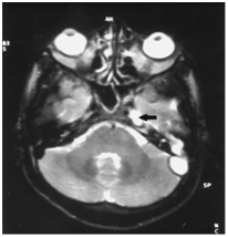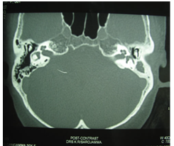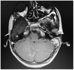 Although a CT scan is not required for patients with facial palsy, it can be useful in therapeutic planning. When cholesteatoma involves the Fallopian canal, it may also erode structures such as the labyrinth or tegmen. When petrous apicitis is suspected, a CT scan should be performed to make the diagnosis and to evaluate surrounding anatomy. CT scan will also aid in the diagnosis of intracranial complications that often accompany this condition.MRI accurately shows the site and extent of the apical abscess (Figure 4).