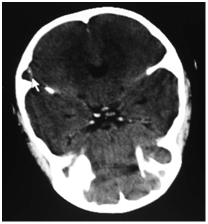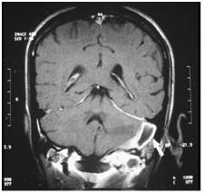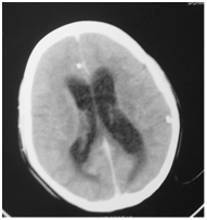Imaging is required to rule out concomitant intracranial complications, or evidence of increased intracranial pressure. CT scan may show ventricular dilatation (Figure 10). In cases of otitic hydrocephalus, an MRI and magnetic resonance venogram should be performed to evaluate for ventricular enlargement, or coexisting intracranial complications, such as significant sinus thrombosis with obstruction. Magnetic resonance venogram will also confirm the presence of lateral sinus thrombosis, but is not required to make a diagnosis of otitic hydrocephalus.