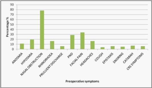 Of the 100 patients, 55 were male and there was a mean age of 50 years (range 19-81). All patients had standard symptoms of CRS but 90% in the study had a detailed description of symptoms. Of those, described symptoms were as follows: nasal obstruction (78%), facial pain (33%), hyposmia (20%), anosmia (11%), post nasal drip (28%), headaches (17%) and rhinorrhoea (16%) (Figure 1).