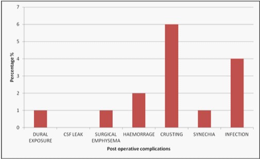 Figure 3 Post operative complications encountered after surgery. The most common of which includes crusting (6%), Infection (4%) and Hameorrage (2%).