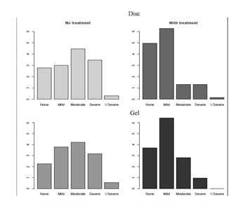 In terms of reflux severity, subjects using the disc intervention reported a significant reduction in reflux severity when compared with baseline (one sided U-test p value <.001). (Figure 2) Subjects using the gel also experienced a significant reduction in reflux severity when compared to baseline values (U-test p value <.001). When the performance between the disc and gel treatments was compared, a statistically significant difference was not observed (U-test p> 0.13).