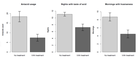 Hoarseness was also significantly reduced with disc and gel treatment (p <.001) with comparison between the two products not statistically significant (p = 0.41) (Figure 3). The disc treatment resulted in a 60% reduction in antacid use while the gel intervention demonstrated a 45% reduction. Values were significantly different for both treatments. A T-test comparing the two treatments did not show a significant difference (p = 0.89) (Figure 3).