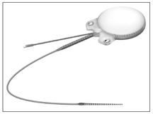Figure 1 Digisonic®SP monoaural - Illustration shows the internal component receiver stimulator and a small region magnetic structure in a sealed ceramic titanium base. Observe the lateral niche for the two set the crews.