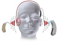 Figure 3 Scheme demonstrating the sounds captured by the microphone of the speech processor and the conventional contralateral microphone connected to it. Both are processed by the speech and sent to a single implanted receiver-stimulator, responsible for transmitting information to both beams ipsilateral and contralateral electrodes processor, so that they promote synchronous pacing in the remaining nerve fibers in both cochlea.