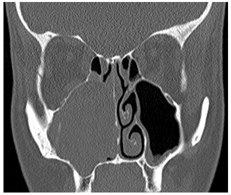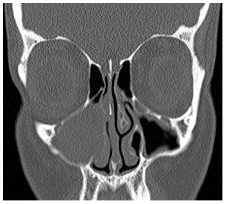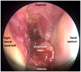 A 39year old Caucasian female presented with a few years history of progressive right sided nasal blockage with no associated history of epistaxis, headache or pain. She was a non-smoker and otherwise fit and well. On examination, there was decreased air entry on the right side. Nasal endoscopy revealed a straight nasal septum but the right nasal cavity was smaller compared to the left side. Endoscopically, no intranasal lesion was identified but because of the bulge in the right lateral nasal wall, a computed tomogram (CT) of her paranasal sinuses was arranged. The CT scan revealed soft tissue opacity in the right maxillary sinus with expansion of the sinus into the right nasal cavity but no evidence of bony erosion (Figures 1&2).