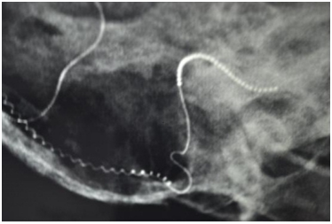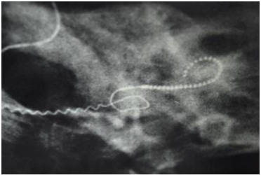 One of the 4 patients during the follow up examination at 21 months was found to have the exposure of the electrodes visible through the external auditory canal. Apparently the blind sac closure had given away. A transorbital X ray done on the same day showed the electrode having come out of the cochlea (Figure 3). He was planned for a re exploration the next day. Exploration showed the mastoid cavity to be absolutely normal, However there was evidence of the presence of cholesteatoma in the external auditory canal alone. There was no evidence of cholesteatoma in rest of the mastoid cavity (Figure 4). The cholesteatoma was removed and the electrode reinserted. The blind sac closure was revised again The post operative x ray done one day later showed the electrodes in place (Figure 5). A computerized scan done 3 months later showed proper placement of the electrodes with no evidence of any soft tissue in the cavity.