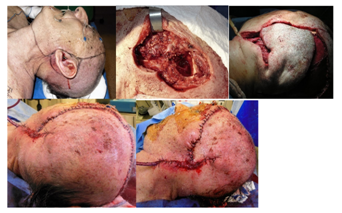 Malignant tumors of the parotid gland and temporal bone that compromise the skin of the region represent neoplasms with an advanced local stage, and therefore with a poor prognosis. In two studies of patients with ear tumors treated by temporalectomy, they reported a 3-year disease-free survival rate of 38%.1 and an overall 5-year survival of 31%.2 Surgery is the best treatment given the location and the most common histologies of these tumors. Reconstruction of the defect created by resection of the pinna and surrounding skin is challenging since different types of flaps can be used and there is no consensus on which would be the best option. The type of reconstruction (mobilization of local tissues, transfer of adjacent head and neck sites or distant sites such as free flaps) will depend on the size of the defect, the patient's comorbidities, previous treatments, and the viability of the vascular pedicles that supply the flaps or representing the site for performing the microanastomosis. We also believe that the reduction of surgical time due to the choice of simple reconstructive techniques, and that have aesthetic results similar to other more complex ones, should be the first choice, especially in these patients with tumors with a poor prognosis. In one study they reported that a history of previous radiation therapy, more than 10 hours of anesthesia, and a high rate of comorbidities were associated with a greater number of peri and postoperative complications. Advanced age (>70years) and the highest number of comorbidities were associated with a greater severity of complications.3 Serletti reported that patients with an ASA III or IV classification had a high rate of medical, non-surgical complications after reconstruction with free flaps. When the elevated ASA was associated with a surgery time greater than 10 hours, there was an increase in surgical complications. In our study,3,4 patients were over 70years old, one also had an ASA IV anesthetic risk, and two antecedents of previous treatment with radiotherapy. The most commonly used local flaps to reconstruct the temporal-parotid region are those of the scalp. The irrigation comes from the superficial temporal artery and the occipital artery. The superficial temporal artery is usually sacrificed on resection.