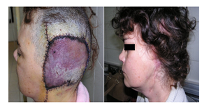 Two had a history of previous radiation therapy. In parotid gland tumors, surgery consisted in: extended total parotidectomy with resection of the masseter muscle, partial removal of the pinna and skin with preservation of the facial nerve and modified radical neck dissection (N1). In another, a total parotidectomy was performed with resection of the facial nerve, and a partial excision of the pinna and the skin of the region. In two patients with ear tumors a lateral temporalectomy was performed and in another a subtotal. Two also had a superficial parotidectomy and another a total. In all, the pinna and skin of the region were resected. In one, a radical neck dissection(N2) was added. The reconstructions were made with local or regional flaps. In one patient with a skin defect of 7cm x 3.5cm, an anterior cervical flap was used, in two others with defects of 8cm x 6cm and 8cm x 7cm, rotating scalp flaps were made. Figures 1-3.