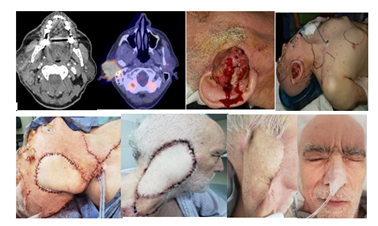 Malignant tumors of the temporal bone and parotid gland that infiltrate the surrounding skin have a poor prognosis. The extension of the tumor to the skin in salivary gland cancer is staged as T4-A, and the extension to soft tissues greater than 0.5cm in temporalbone cancer according to the staging of the University of Pittsburgh is considered T4. In soft tissue reconstruction, this prognosis should be considered and repairs should be indicated that reduce the time of surgery, cause little morbidity and are aesthetically similar to other more complex techniques. The use of local and regional flaps meet all the conditions described above, and are often the best option to repair soft tissue defects caused by surgery.