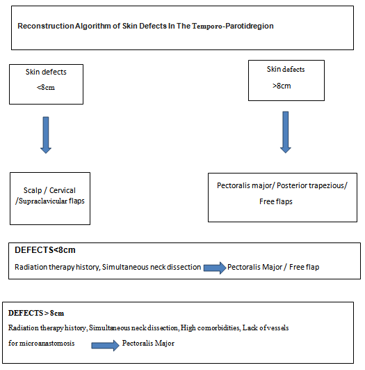 Objectives: To determine the result of reconstruction with local or regional flaps of skin defects in the temporo-parotid region, after resection of malignant parotid gland and ear tumors, and to establish a reconstruction algorithm according to the size of the defect.