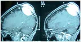 A 60-year-old female patient native of St. Lucia was admitted in the department of Neurosurgery with a mass in the left parietal bone. There was no other medical history of note for this patient. The patient had discovered the mass herself three months ago. She had no other complaints. The mass measured 4cm x 5cm x 5cm approximately and was firm in consistency but lessstiff than bone tissue. Systemic and neurological examinations revealed no other abnormalities. Routine blood tests turned out to be normal.