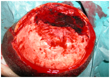 During surgery, we found an extra dural bone lytic lesion. The dura- mater was intact and was not invaded by the tumor. On the other hand, we found tumor invasion in the scalp. In fact, the normal tissue was not recognizable beside the tumor. We removed the tumour completely and scratched and coagulated the inner layer of scalp about 2cm around the resection. Therefore the resection was macroscopically complete.