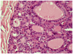 Histological examination showed the metastatic origin from a follicular carcinoma of the thyroid with extracapsular spread, nuclear polymorphism and increased nucleo-cytoplasmic ratio (Figure 3).