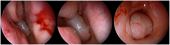 Figure 1 From left to right, sphenochoanal polyp arising through right sphenoethmoidal recess and obstructing both choanae. Right middle meatus can be seen free from disease.