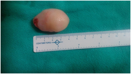 A 27year old female presented in OPD with complaint of right side nasal obstruction since two years with mouth breathing and snoring since 1year. Symptoms were gradually progressive. There were no allergic symptoms like rhinorrhea or recurrent sneezing. Her anterior rhinoscopy examination was normal, but on diagnostic endoscopic examination, pale whitish polyp was seen, which on decongestion was seen coming through right sphenoethmoid recess and nasopharynx. Left choanae was also blocked by the mass. The right and left middle meatus were clear of any pathological changes (Figure 1). Paranasal sinuses Computed tomography showed hypodense soft tissue density mass lesion with CT attenuation of 20-30 HU filling right sphenoidal sinus and extending through sphenoidal ostium, across spheno-ethmoidal recess into nasopharynx causing obstruction of both posterior choana and extending upto posterior pharyngeal wall (Figure 2). The polyp was removed via endoscopic transnasal approach. The polyp was found to attach to the junction of lateral wall and floor of sphenoid. The attachement was identified and the polyp was removed en block from its stalk and the stalk was debrided. Histopathological examination of the specimen revealed as inflammatory polyp (Figure 3).