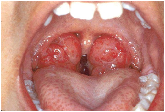 In measles, hemorrhagic complications are uncommon, however there is a rare variant known as hemorrhagic measles that affects mostly immunocompromised patients.3 Tonsillar hemorrhage (Figure 1) is a rare finding in Von Willebrand disease, there are two cases reported in literature where the tonsillar hemorrhage was the first manifestation of the disease.4