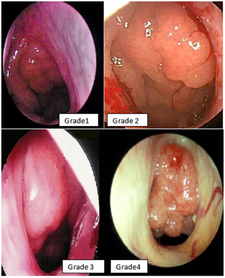 Prospective study candidates were examined and investigated in the ENT outpatient clinic to confirm the eligibility. Diagnostic nasal endoscopy (DNE) was performed in all of them. Adenoid hypertrophy was graded into four grades according to the Parikh’s classification system4 (Table 1 & Figure 1).