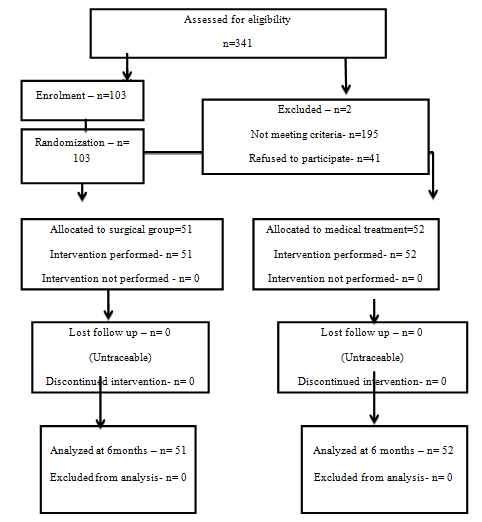 For analyzing the consolidated symptoms score (primary outcomes), within each group separately, Wilcoxon Signed Ranked Test was used. In surgical group, 49 out of 51 showed significant improvement in symptom scores (Table 3) after the follow up period. The difference between pre and post intervention symptom score was statistically significant (p value <.000). Two patients in surgical group presented with recurrence of disease during follow up of six months.