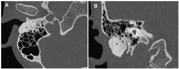 Figure 1 Right Temporal bone CT scan, Axial cut (A) and saggital cut (B) showing a hyperdense bony mass (O) occluding the ear canal extending posteriorly into the mastoid in close relationship with the facial nerve(white arrow) and inferiorly to the stylomastoid foramen (S).