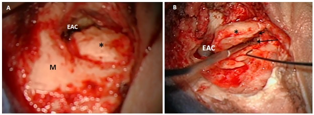 Figure 2 Operative view of posterior approach of right ear. A: a big osteoma (*) filling the ear canal (EAC) and extending to the mastoid cortex (M) and extending inferiorly. B: after cortical mastoidectomy, the mastoid facial nerve is identified till its emergence from the stylomastoid foramen(long arrow); osteoma (*) ;styloid process (short arrow).