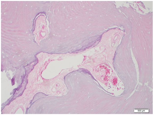 The resection of tumor was performed using posterior transmastoid approach (Figure 2). After a cortical mastoidectomy, the mastoid segment of the facial nerve was identified and followed down till the SMF. The osteoma was identified in the anteroinferior part of the mastoid process about 1mm lateral to the fallopian canal; the posterior and inferior walls of the EAC were replaced by the tumor which was filling the lateral part of the EAC and extending inferiorly on the vaginal process till the base of styloid process. A gradual drilling around the tumor was performed, taking care of the proximity of the facial nerve, till the mass was complete excised en bloc. Reconstruction of the EAC was done using tragal cartilage and fascia that was covered by the remaining skin. The canal was dressed with gauze with antibiotic and corticoid unguent for 2weeks (Figure 2). The postoperative period was smooth, facial nerve function was intact. Three weeks later, the EAC dressing was removed; the canal was patent and wide and completely epithelized. Histopathology result confirmed the diagnosis of osteoma (Figure 3).