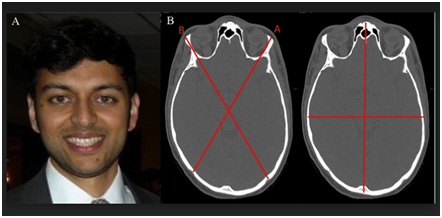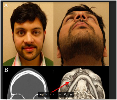 A 29year old male was involved in a motorcycle accident that resulted in a right orbital floor fracture, nasal bone fractures, and right zygomaticomaxillary buttress fracture. He was initially managed at an outside institution and had an attempt at right zygoma fixation and was referred to us for secondary reconstruction 4 months postoperatively. Upon presentation we identified multiple facial bony and soft tissue asymmetries, not all consistent with his fracture pattern. Therefore we had the patient provide a preinjury photograph, which was consistent with preinjury facial asymmetry (Figure 1A), and evaluated his oblique cranial length ratio (OCLR) and cranial vault asymmetry index (CVAI), which were both abnormal. His OCLR was 106% (normal<105%) and the CVAI was 6.1% (normal<3.5%) (Figure 1B). On exam he had right enopthalmos, palpable step off’s at the right orbital floor as well as nasal bones as a result of his injury (Figure 2A). His CT scan after the trauma was consistent with a right orbital floor fracture, nasal bone fractures, plated right zygomaticomaxillary buttress fracture, and malar asymmetry with the left side projecting more than the right (Figure 2B). However, on exam his right eyebrow was superior to the left, right ear lobule inferior to the left, left malar flattening, upper lip, lower lip, and chin deviation to the left. The latter was not consistent with his injury pattern, and likely a result of his remote history of DP. The patient was counseled on the facial aesthetic changes as a result of the trauma and his inherent facial characteristics. The patient desired improvement of his intrinsic malar symmetry in addition to open reduction internal fixation (ORIF) of his right orbit and nasal bones. His treatment consisted of orbital floor reconstruction with alloplastic mesh, nasal bone reduction, and contralateral malar implant placement. Intraoperative navigation facilitated planning and execution. In the postoperative period, the patient displayed clinical and radiographic improvement of his right orbit and nasal bones and improved malar symmetry (Figure 3A) (Figure 3B).