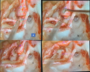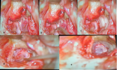 Figure 2 (a-c) Insertion of temporalis fascia along with elevated superior and inferior tympanomeatal flaps. (d-e) both flaps repositioned over the meatal wall, showing the defect covered adequately with graft.