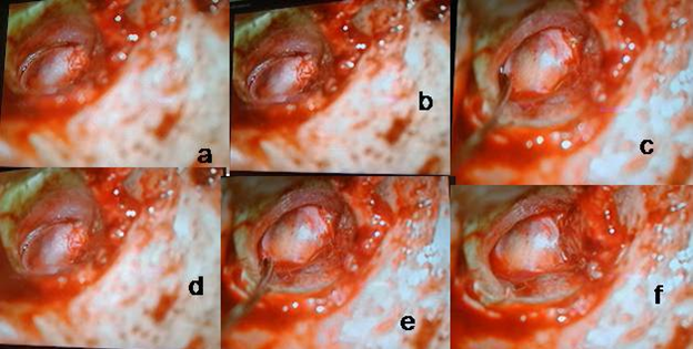 Figure 3 (a,b,d) Fascia graft tucked under TM flap. (c,e) Checking of graft tucking under inferior tympanomeatal flap. (f) Final stage after checking all quadrants of graft placement with visible single 3 o’clock incision in the left ear.