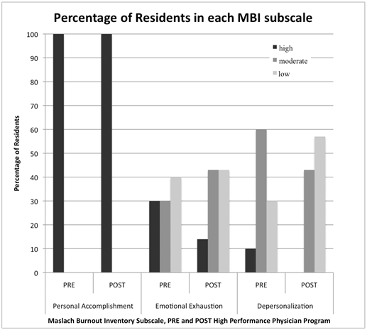 Figure 1 Percentage of residents in each MBI subscale. The percentage of residents within high, moderate, or low categories for each subscale of the Maslach Burnout Inventory (MBI) before and after the High Performance Physician Program.