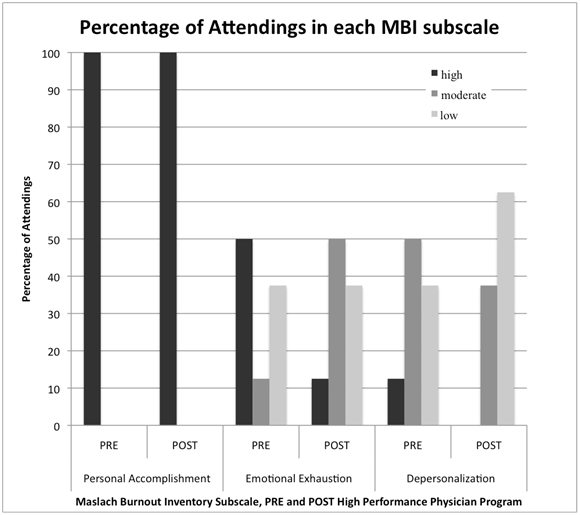Before completing the HPPP, for Emotional Exhaustion: four of eight attendings scored high, one of eight scored moderate, and three of eight scored low. After completing the HPPP, for Emotional Exhaustion: one of eight attendings scored high, four of eight scored moderate, and three of eight score low. These results are summarized in Figure 2.