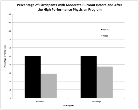 Figure 3 Percentage of Participants with Moderate Burnout before and After the High Performance Physician Program (HPPP). Prior to the HPPP, 50% of residents and 50% of attendings met criteria for moderate levels of burnout. After the HPPP, 29% of residents and 37.5% of attendings met the criteria for moderate levels of burnout.