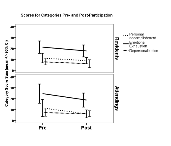 Since all residents and attendings scored high on Personal Accomplishment, none of the participants met the criteria for high levels of burnout. Prior to the HPPP, five of ten residents scored either moderate or high on both Emotional Exhaustion and Depersonalization, suggesting that 50% of residents showed moderate levels of burnout. After the HPPP, 29% of residents showed moderate levels of burnout. Prior to the HPPP, 50% (4/8) of attendings showed moderate levels of burnout. After the HPPP, 37.5% (3/8) of attendings showed moderate levels of burnout. These results are summarized in Figure 3.