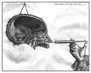 In 1788, an unknown author9 proposed that by making the patient hold his breath, and when ready, it facilitated the insertion of the silver catheter, and enlarged the Eustachian tube opening.10 However, lacking anatomical knowledge and being intimidated by patients’ aversion, most physicians preferred to continue to use therapeutic measures based simply on crude empirical considerations, with no rational anatomical and physiological foundation. As a result, other more difficult and dangerous operations, such as the trepanation of the mastoid process or artificial perforation of the tympanic membrane, were used for the same indication, many years after catheterization had been clearly described.