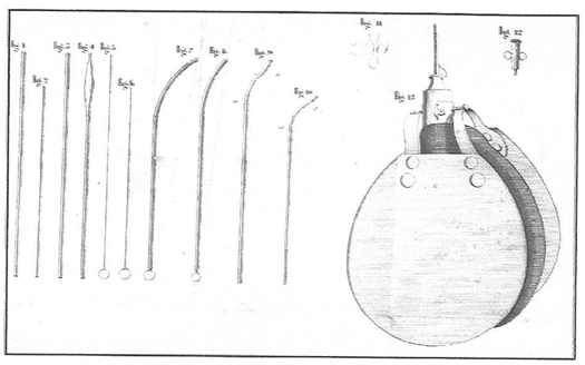 Deleau then concentrated his work almost exclusively on diseases of the middle ear with special emphasis on perfecting the catheterization of the Eustachian tube. In the second part of the 1820’s, he replaced the rigid metallic catheter with a flexible elastic one. He then showed that injections of liquid through the catheter, as recommended by Saissy and Itard,17 not only failed to render hearing, but were also the cause of irreparable lesions. He substituted atmospheric air for the liquid and reintroduced the air douche. It was not a new idea as Cleland and others had already mentioned it. Deleau used an India-rubber ball or an air pump to blow air into the catheter.18 If there were nasal discharge and the foreign objects in the postnasal area, they could enter the tympanic cavity with air sucked into the middle ear through the Eustachian tube while using the air douche, which he substituted atmospheric air for the liquid and reintroduced. It may be asked how he removed nasal discharge and the foreign body around the opening of the Eustachian tube perfectly at that time. Today, of course, such this pre-operative care must be accomplished without fail by the operator before the catheterization of the Eustachian tube.