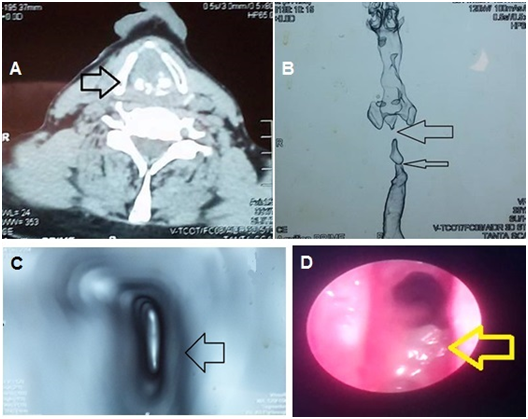 Figure 1 Male patient 45 years old post neck burn: A: High resolution CT neck with contrast/Axial cut showing severe subglottic stenosis. B: 3D reconstruction of the laryngotracheal area showing severe subglottic stenosis. C: Virtual Bronchoscopy image showing subglottic stenosis. D: Bronchoscopic view of the patient showing oedema and secretions of the subglottic area rather than true stenosis.