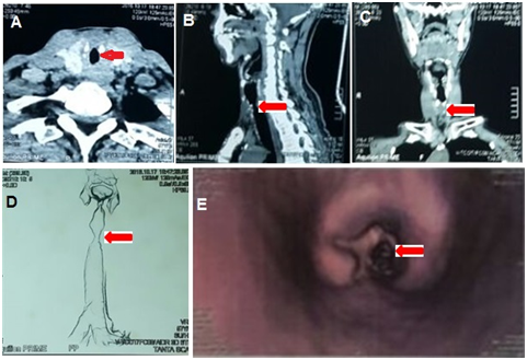 All patients were subjected to routine ear, nose and throat examination to define the etiological factors like scleroma with the common association of nasal manifestations (granulations, atrophic changes or fibrosis) or any other granulomatous diseases. Laryngeal examination was performed using flexible naso-pharyngo-laryngoscopy under local anesthesia for initial assessment of the level, degree of stenosis in the laryngotracheal tract.