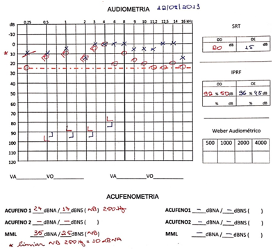 ROR, 38 year-old female, attended the first consultation (August 12th, 2013) complaining of constant tinnitus in the right ear for 40 days, similar to an engine. She sought medical care and was told that her ears and audiometry were normal. She was prescribed oral steroids for 10 days without improvement. Then, ROR sought our services.