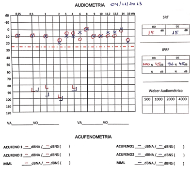 The audiometry brought from another examination showed bilateral normal thresholds with asymmetry at 250Hz, 6000Hz and 8000Hz. We expanded the audiological battery to evaluate all symptoms (Figure 1): 1) pure tone audiometry (250-16,000Hz): asymmetry in nine frequencies, even with thresholds ≤ 25dBNA; 2) Pitch and loudness matching: 250Hz, narrow band noise, 17dBNS (average 5-10dBNS); 3) Loudness Discomfort Levels: 80-100dBNA in both ears (normal ≥95dBNA).